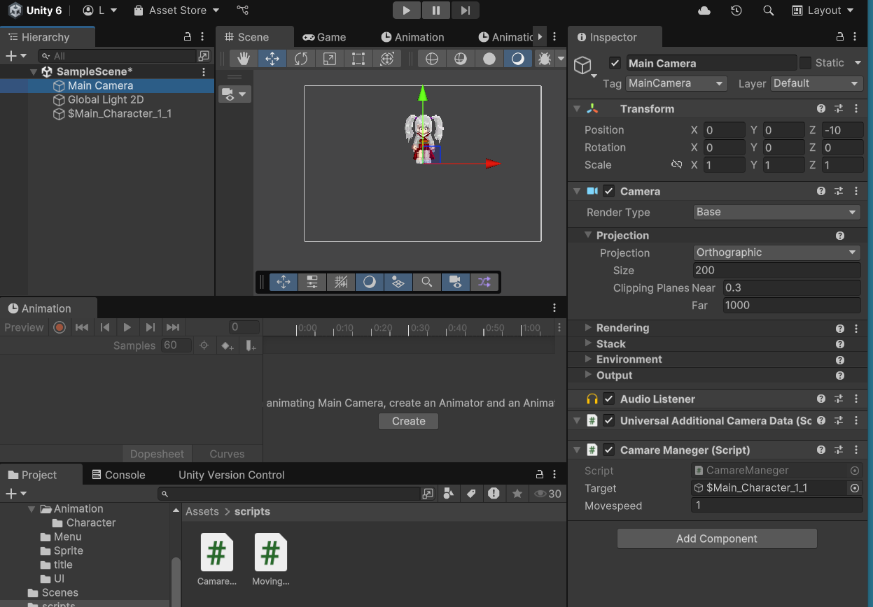 카메라가 캐릭터랑 동일 z 값에 있으면 둘이 겹치게 되는 문제가 발생하므로 -10 포지션을 유지할 수 있게 해준다.