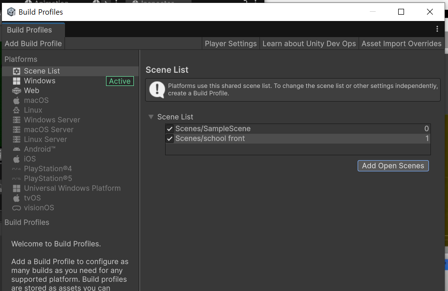 아직 빌드세팅에 씬을 추가하지 않아 맵 이동이 이뤄지지 않는다.