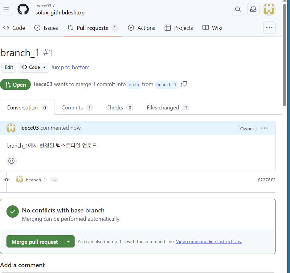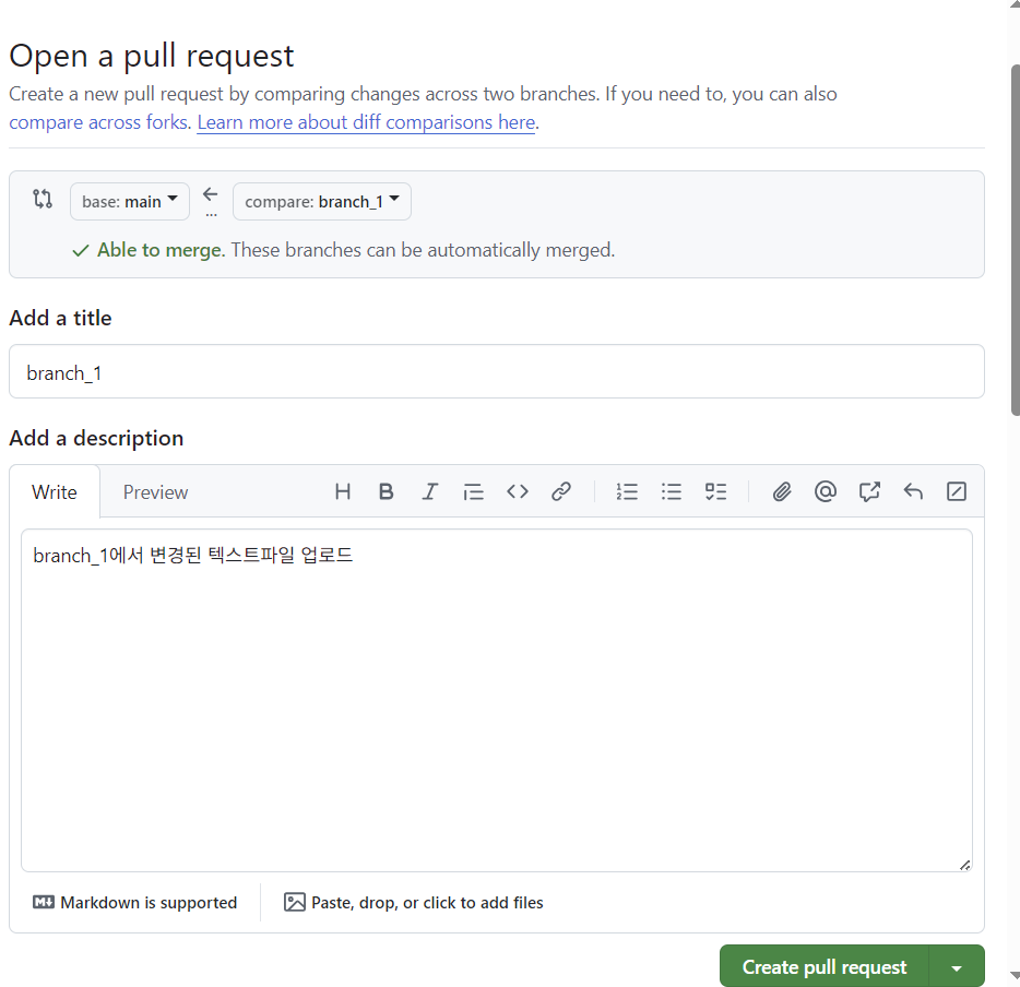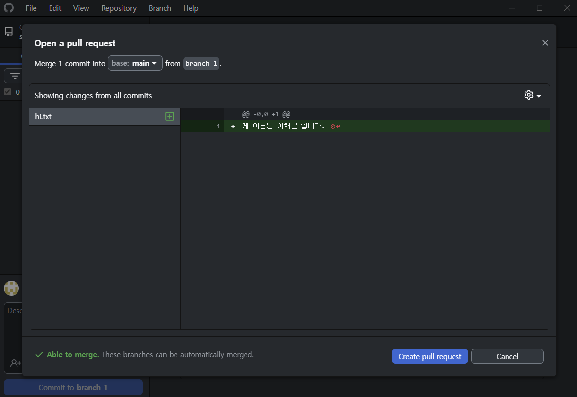 pull 이후 자동으로 깃허브 페이지로 이동하게되ㅣ고 여기에 메세지를 남길수 있다.