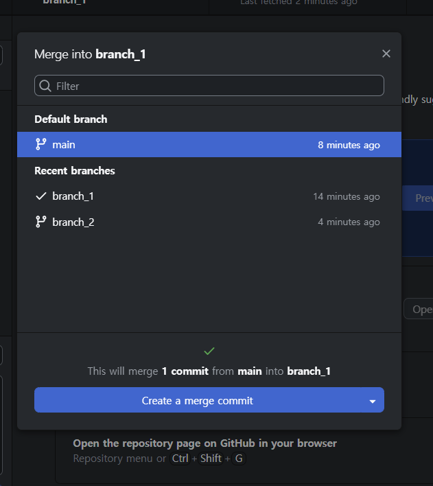 내 브랜치에서 choose a branch to merge into branch_1 버튼을 누른다