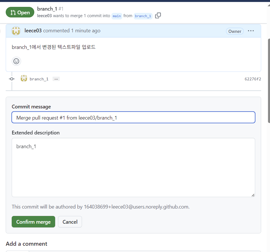 이후 상의하에 merge 버튼을 누르면 메인브랜치에 이가 반영된다.