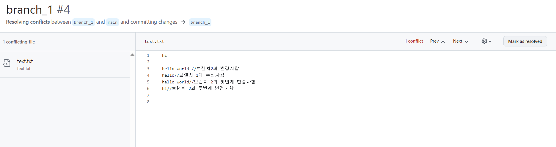브랜치 1에서 메인과 동기화하지 않고 텍스트파일을 수정한 후 pull request를 요청하려 할 때, main과 merge가 불가능하다는 메세지가 뜬다.