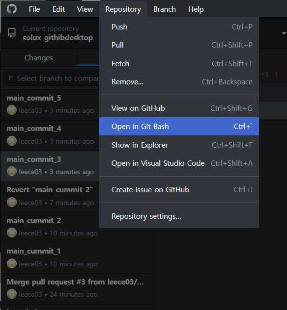 레파짓토리에서 open in git bash 버튼으로 깃 배쉬를 실행한다.