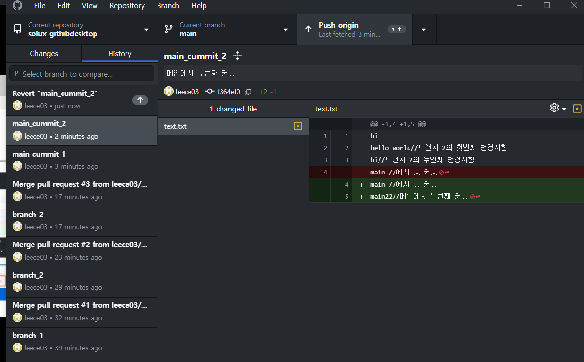 이후 push origin 버튼을 누르면 revert가 성공하게된다