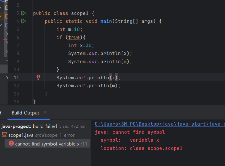 x 변수는 if블럭 안에서 정의 되었기 때문에 밖에서 출력을 시도할 경우 java: cannot find symbol 오류가 남