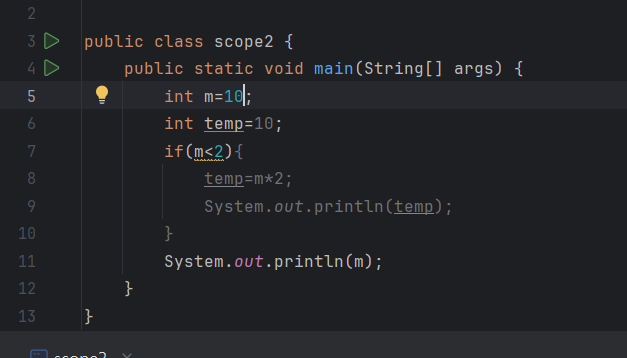 임시적으로 m변수의 값을 변경해주기 위해 temp변수를 사용해주고 있다. 즉 불필요한 메모리를 사용하고 있어 코드블럭 밖에서 temp의 메모리를 제거하면 메모리를 더 효율적으로 쓸 수 있게 된다. 또한 temp는 코드 블럭 내에서만 활용되는데 전체 범위에서 생존하므로 코드 블럭의 복잡도가 증가하게 되었다.