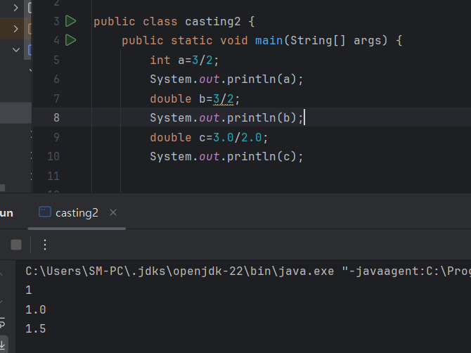 3/2의 경우 정수끼리의 계산이므로 계산된 정수 값이 변수에 저장되에 1.5가 아닌 1 값이 저장된다.