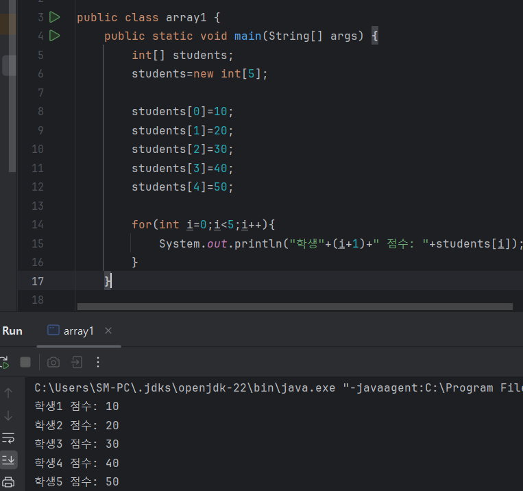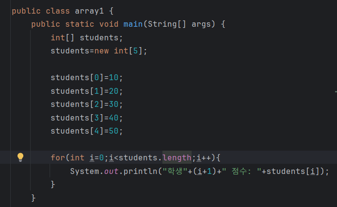 System.out.println("학생"+i+1+" 점수: "+students[i]); 이런 형식으로 쓴다면 문자+ 숫자의 형태로 인식이되어 1이 그대로 출력됨에 유의해준다..