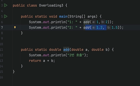 두 메서드는 이름이 add로 같지만 매개변수의 타입이 다르다