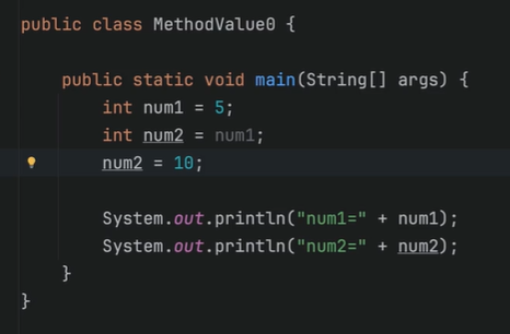 결과적으로 num2의 값은 10으로 변경되고 num1의 값은 5로 유지된다.
